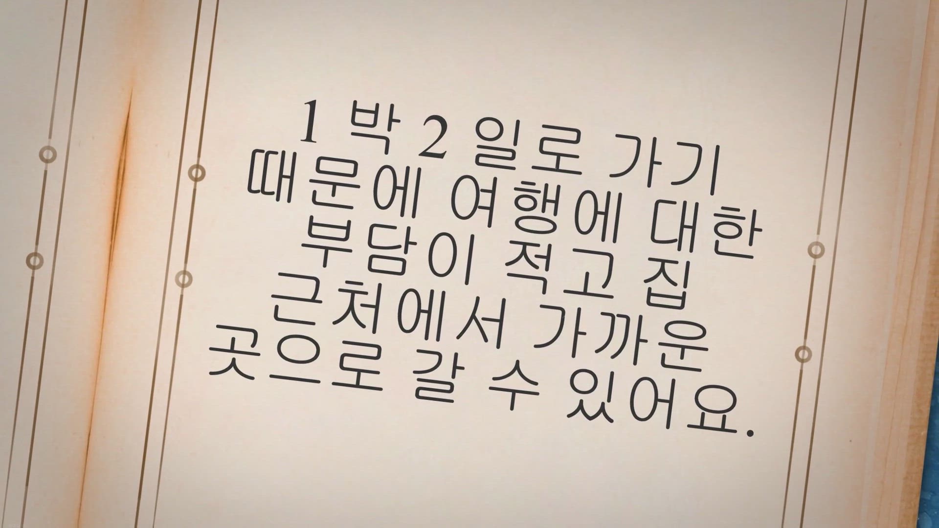 주말과 공휴일에 가면 좋은 1 박 2 일로 갈만한 여행지를 추천해요. 1 박 2 일로 가기 때문에 여행에 대한 부담이 적고 집 근처에서 가까운 곳으로 갈 수 있어요.